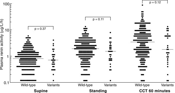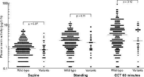 Figure 3. Renin values in postural test and after captopril administration. Individual plasma renin activities at supine, upright, and in response to captopril administration (CCT; 60-minute values) in carriers and non-carriers of the three ENaC variant alleles. The horizontal bars indicate the median renin values in each group.