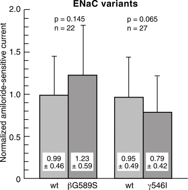 Figure 5. Channel activity of βENaC G589S and γENaC V546I variants in vitro. Comparison of channel activity of hENaC wild-type, and the βhENaC G589S and γhENaC V546I variants, when expressed in Xenopus oocytes. ENaC activity was measured as amiloride-sensitive Na+ current. Absolute currents were 5.09 ± 0.98 and 6.75 ± 1.23 μA for ENaC wt in the two series of experiments (number of oocytes given in parentheses).