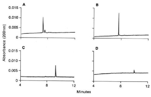 FIG. 4. Determination of purity by capillary electrophoresis of reverse&phase HPLC fractions. samplweass injected onto a 72-cm capillary with 50 mM sodium phosphate, pH 2.5, at 45 C, with a 25 kV current. A, fraction 57; B, fraction 61; C, fraction 73; D, fraction 75