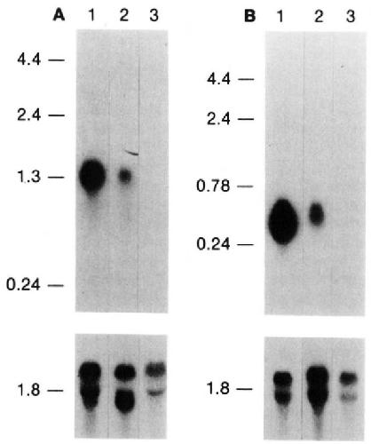 actin cDNA is the probe for the bottom panel of both A and B. The