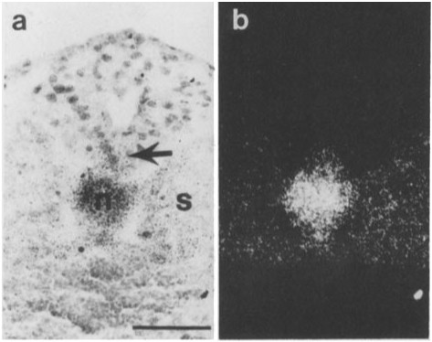 Figure 10. Bright-field (a) and dark-field (b) micrographs of a section through the same embryo as that shown in Fig. 9 at a level between c and e, shown at higher magnification . Label can be clearly localized in the floor plate (arrow), notochord (n), and somites (s), Bar, 100 um.