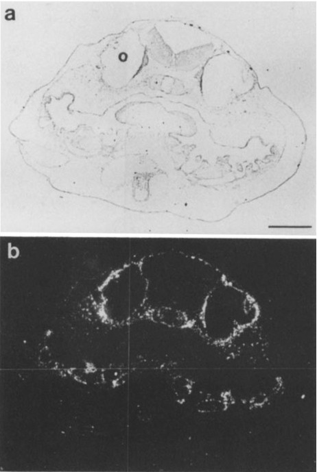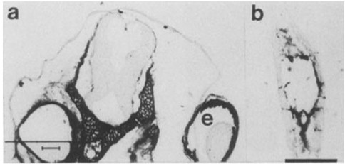 Figure 12. Immunolocalization of type II collagen at stage 46 in the head (a), as seen in frontal section, and the trunk (b), shown in cross section. Antigen is detected in the chondrocranium, eye (e), vertebra, and other regions expressing the mRNA, with the exception of the ectoderm Bar, 250 um