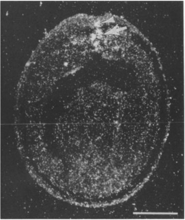 Figure 6. Dark field micrograph of a cross section through a stage 14 embryo probed for type II procollagen mRNA with an exon 2 sequence . Essentially identical results are obtained with the general probe (not shown) . There is significant signal in the notochord (ar- row), sub-notochordal rod, and peri-notochordal regions of the somites, as well as in the floor plate (arrowhead). Bar, 250 um.