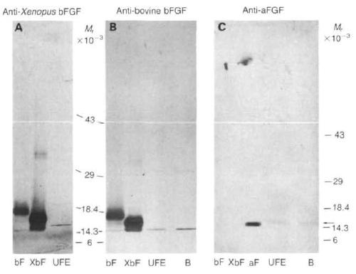 ???displayArticle.abstract??? Mesoderm induction, the earliest inductive cell-cell interaction in vertebrate embryogenesis, is thought to be mediated by polypeptide growth factors including fibroblast growth factor (FGF). Here we present an immunocytochemical analysis of FGF during mesoderm induction in Xenopus laevis. Antibodies to both basic and acidic FGF were immunoreactive with oocytes and early embryos. Immunostaining was predominantly intracellular and was concentrated in the marginal zone and vegetal pole throughout cleavage and blastula stages. In addition, basic FGF (bFGF) antibodies showed intense nuclear staining in these regions, at and following the mid-blastula transition, when embryonic transcription begins. Acidic FGF (aFGF) also appeared in some nuclei at these stages. Taken together the evidence suggests that FGF is prepositioned in mesoderm-forming regions and is actively involved in mesoderm induction in vivo.