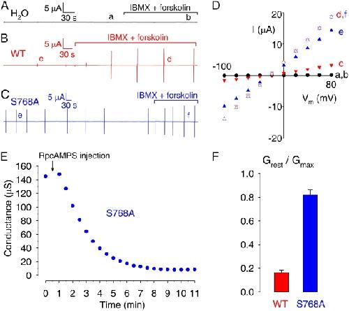 Figure 3. . Membrane conductance of resting and activated oocytes expressing WT or mutant S768A CFTR. Current time courses, recorded under two-microelectrode voltage clamp, of oocytes injected with water (A), or with cRNA encoding (B) WT or (C) S768A CFTR. Membrane potential was held near the resting potential (between −40 and −20 mV). Membrane conductance was monitored at regular intervals using brief voltage steps (vertical lines); complete current/voltage (I/V) relationships were determined under resting conditions (time points a, c, e), and after activation of cellular PKA with 50 μM forskolin + 1 mM IBMX (time points b, d, f). (D) Representative I/V plots under conditions as indicated in A–C, showing steady currents measured by averaging current samples toward the ends of 75-ms steps to voltages between −100 and +80 mV. (E) Rapid reduction of resting conductance (from 145 to 8 μS) upon injection of RpcAMPS into an oocyte expressing S768A CFTR. (F) Ratios, for WT- and S768A-expressing oocytes, of membrane conductances at rest (Grest), and after maximal activation of CFTR (Gmax); conductance values were similar for oocytes injected with 2.5 or 5 ng of each cRNA, so pooled results are shown. |