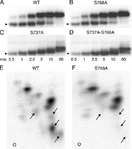 Figure 8. . (A–D) Time courses of in vitro phosphorylation of R-domain peptides with COOH-terminal His tags. WT (A) and mutant R-domain peptides, with Ser768 replaced by alanine (S768A; B), Ser737 replaced by alanine (S737A; C), or Ser737 and Ser768 both replaced by alanine (S737A-S768A; D), were phosphorylated with 10 nM PKA and 5 μM γ32P-MgATP for 0.5–60 min as indicated. Samples were subjected to SDS-PAGE and analyzed by autoradiography; the arrowheads indicate relative molecular mass of 28 kD. The major mobility shift (to band 3; Figs. 1 and 2) was seen in the WT and S768A peptides, but not in the S737A or S737A-S768A peptides. The kinetics of R-domain phosphorylation, as demonstrated by the mobility shifts, was little altered in the two S768A mutants. (E and F) Two-dimensional tryptic phosphopeptide maps of His-tagged WT and S768A R-domain peptides phosphorylated in vitro as in A and B, but for 0.5 min with 10 nM PKA and 50 μM γ32P-MgATP, and then subjected to SDS-PAGE and analyzed by autoradiography. The lower radioactive bands were excised, digested overnight with 50 μg/ml TPCK-trypsin, and the digests separated on thin layer cellulose plates by electrophoresis at pH 3.5 in the first dimension and ascending chromatography in the second dimension. O, 0rigin; left, positive; right, negative. Four spots (arrows) in the WT R domain map are absent from the S768A map, but no similarly striking differences are seen in the pattern or intensity of other spots. |