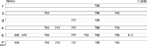 Figure 9. . Summary of R-domain serines found to be phosphorylated by mass spectrometric analysis of trypic digests of bands (1, 2, 3, 4, 6 as indicated) from SDS-PAGE gels after in vitro phosphorylation (data from Fig. 2) or of full-length WT CFTR isolated from resting oocytes (in vivo; data from Fig. 4). Ser 768 is the first site phosphorylated, and is found phosphorylated in oocytes at rest; the major mobility shift to band 3 is associated with phosphorylation of Ser 737. |
