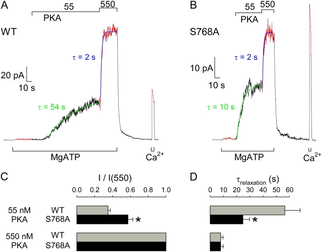 Figure 5. . Activation in excised patches of macroscopic WT and S768A CFTR currents by low and high concentrations of PKA catalytic subunit. (A and B) Currents recorded in patches containing hundreds of WT (A) or S768A (B) CFTR channels. No substantial current is activated in either case by 2 mM MgATP applied ∼2 min after patch excision, but 55 nM, and 550 nM, PKA catalytic subunit activate increasing amounts of current in both cases. Solid green and blue lines show single-exponential fits to the current time courses, with indicated time constants; activation/inactivation time course of endogenous Ca2+-activated Cl− channel current elicited by a brief pulse of 2 mM Ca2+ was used to estimate the speed of solution exchange. (C) Fractional current activated by 55 nM PKA was significantly smaller for WT (gray bar) than S768A (black bar; *, P = 0.0024) CFTR channels; mean steady current in 55 nM PKA was divided by mean steady current in the same patch at 550 nM PKA. (D) Time constants of macroscopic current relaxations upon addition of 55 nM (top) or 550 nM (bottom) PKA, for WT (gray bars) and S768A (black bars) CFTR; activation was faster for S768A at low (*, P = 0.036), but not at high [PKA]. |