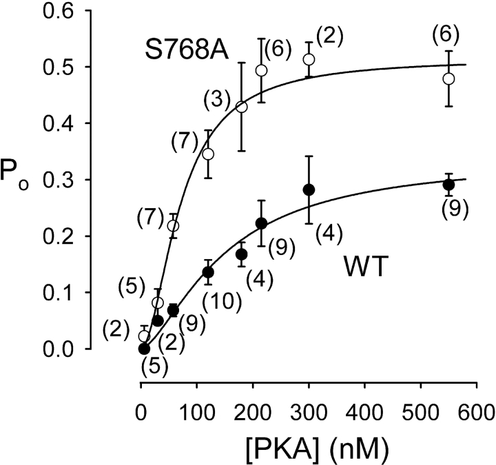 Figure 7. . Dependence on [PKA] of open probability, Po, of WT (•) and S768A (○) CFTR channels. Steady-state mean Po measured in (n) excised patches, containing few channels, during exposure to 6–550 nM PKA plus near-saturating [MgATP] (1–2 mM), is plotted against [PKA]. Lines show nonlinear least-squares fits to the Hill equation, yielding Po,max = 0.34 ± 0.06, K0.5 = 149 ± 46 nM, nH = 1.5 ± 0.5 for WT, and Po,max = 0.51 ± 0.05, K0.5 = 71 ± 12 nM, nH = 1.8 ± 0.5 for S768A. |