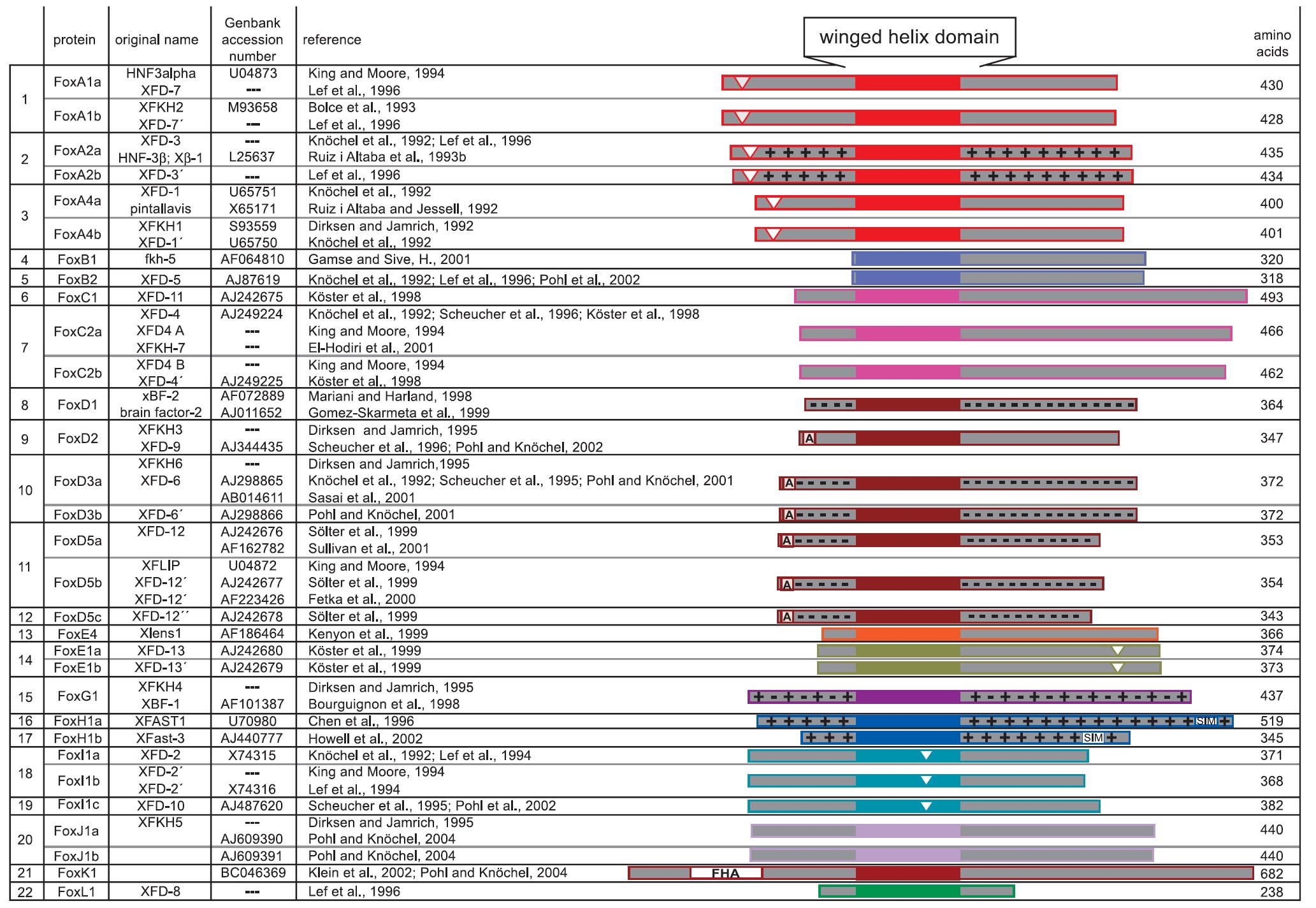 Transcription factors of the Fox (fork head box) family have been found in all metazoan organisms. They are characterised by an evolutionary conserved DNA-binding domain of winged helix structure. In the South African clawed frog, Xenopus laevis, more than 30 Fox genes have been found so far. This review summarises our present knowledge regarding the general structure and common features of the fork head box and will then characterise Fox genes that have been described in Xenopus. Special attention was paid to the temporal and spatial expression patterns during early embryonic development. For some of these genes, the molecular mechanisms leading to their regulation after the onset of zygotic transcription are known. We also report on functional aspects including target gene regulation, cell or tissue specification and interference with the cell cycle. Finally, Fox proteins serve as mediators of signalling pathways and they might function as checkpoint molecules for the cross-regulatory interactions of different intracellular signal transduction chains.