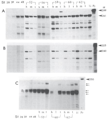 56 (prometamorphosis); (3) stage 62 (late-metamorphic climax). The three stages shown are to the same scale.