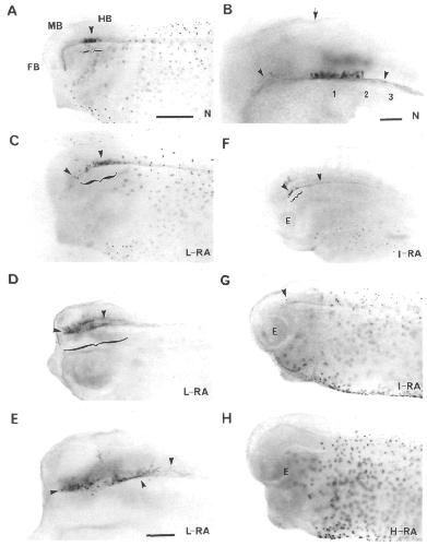 plane of focus. E, eye; FB, forebrain; HB, hindbrain; MB, midbrain; N, untreated control embryos; o, otic vesicle; RA,