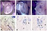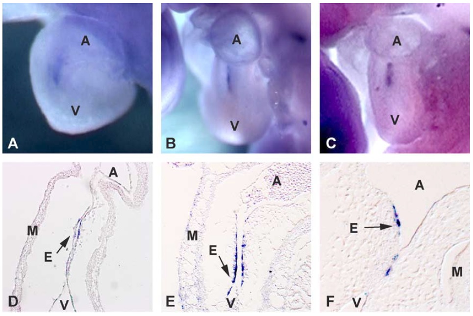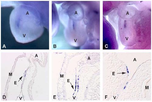 cardiac cushions of chicken hearts at stage 16 (A), stage 20 (B), and stage 24 (C). Section in situ hybridizations of stage 16 (D), stage 20 (E), and stage 24 (F)