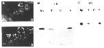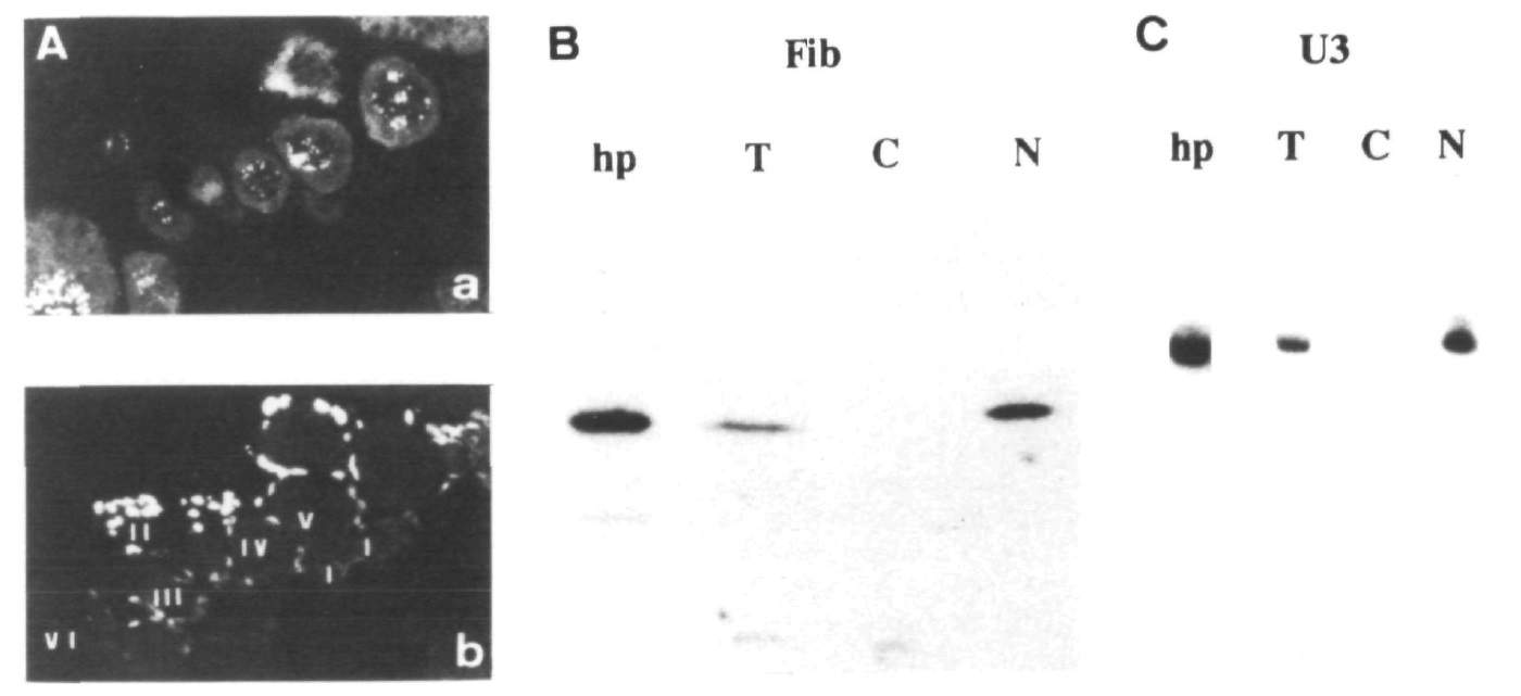 Fig. 3. Nuclear localization of fibrillarin and U3 snRNA in Xenopus laevis oocyte (A) Indirect immunofluorescence microscopy on frozen sections of Xenopus ovary (a) Using the autoimmune antiserum against fibrillarin. Note the bright fluorescence of the amplified nucleoli as early as stage II (stages indicated in b). (b) Corresponding DAPI fluorescence. The nuclei of the follicule cells are stained (B) Western blot (Fib). Protein extracts were prepared from the different fractions as described in Materials and methods and analyzed by electrophoresis on a 12% SDS-PAGE. The gel was blotted onto nitrocellulose and probed with antiserum against fibrillarin. Detection of the complexes was achieved by 125I-proteinA. hp, Xenopus hepatocyte nuclei; T, total fraction of stage VI oocytes; C, cytoplasmic fraction; N, nuclearfraction (C) Northern blot (U3). RNA was prepared from the different fractions as described in Materials and methods and electrophoresed on a denaturing 7M urea - 5% acrylamide gel. After electrotransfer onto nylon filter, hybridization under stringent conditions was carried out with a 3' labeled synthetic oligonucleotide complementary to U3 snRNA (nt101-122). hp, Xenopus hepatocyte nuclei; T, total fraction of stage VI oocytes; C, cytoplasmic fraction; N, nuclear fraction |