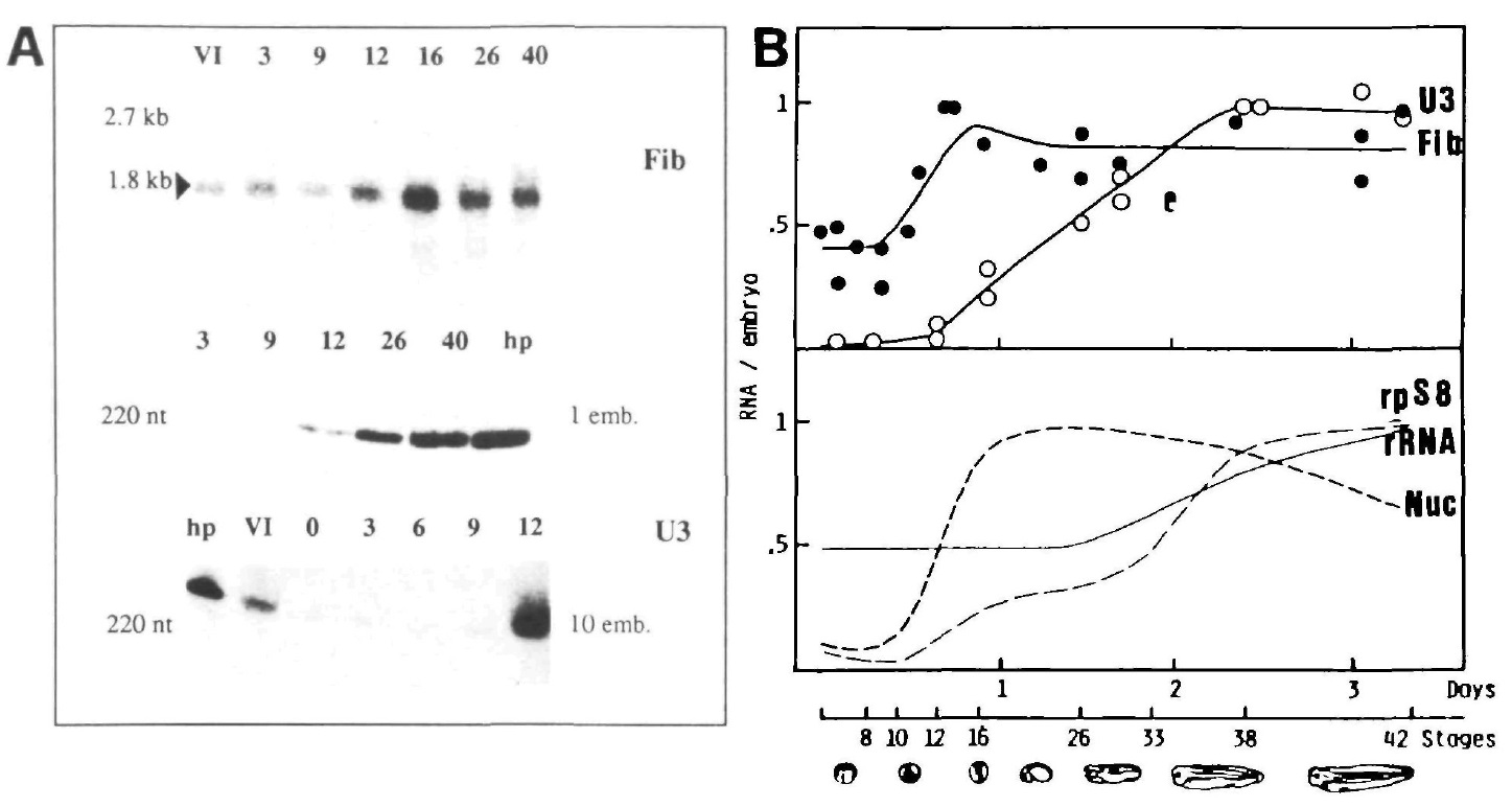Fig. 4. Fibrillarin mRNA and U3 snRNA accumulation during embryogenesis (A) Northern blot. Fib - Total RNA equivalent to one embryo was separated by electrophoresis on a denaturing-formaldehyde 1 % agarose gel,electrotransferred on a nitrocellulose filter and hybridized with a nick-translated Xenopus fibrillarin cDNA as a probe. U3- Total RNA equivalent to one or ten embryos was separated by electrophoresis on a denaturing 7 M urea-5 %polyacrylamide gel, electrotransferred to nylon filter and hybridized with a 3' labelled 22-mer synthetic oligonucleotide complementary to U3 snRNA (nt 101-122) hp, Xenopus hepatocyte nuclei, VI, stage VI oocytes; 0 to 40, stages of embryogenesis. (B) Quantitative data. Relative expression of fibrillarin mRNA, U3 snRNA, S8 rp-mRNA and rRNA during oogenesis. Upper panel: values, obtained by densitometric quantitation of the several experiments, are expressed relative to the highest point. Fibrillarin mRNA ( ⢠⢠); U3 snRNA (O O). Lower panel- already published curves for rRNA (solid line); r-protein S8 mRNA (long broken lines), nucleolin mRNA (short broken lines) |