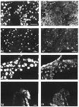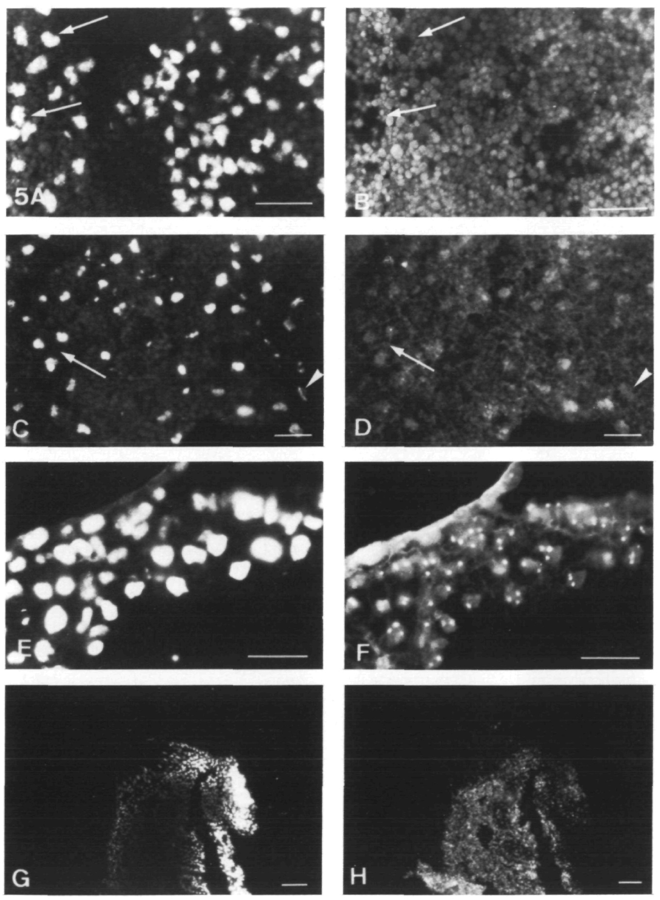 Fig. 5. Localization of fibrillarin in Xenopus embryos. Indirect immunofluorescence staining, using antifibrillarin antibodies, of cryostat sections of embryos at different stages: control experiment, without the first antibody (A,B); blastula (C,D), late neurula; ectodermal cells (E,F); swimming tadpole (G,H). B,D,F,H, FITC images. A,C,E,G, corresponding DAPI images. Scale bars: in A,B,C,D,E,F=50um; G,H=100um The autofluorescence of yolk platelets is also observed in control (B). |