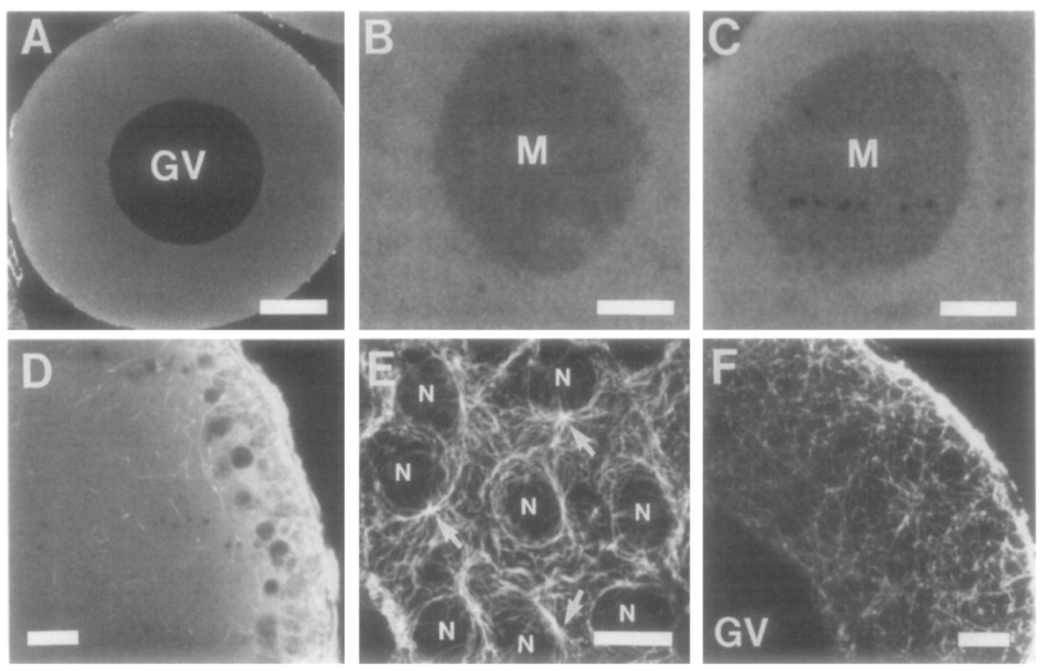 return to room temperature (60x obj; bar is 20 pm). (E) Extensive microtubule assembly is apparent in the animal hemisphere of this oocyte, 5