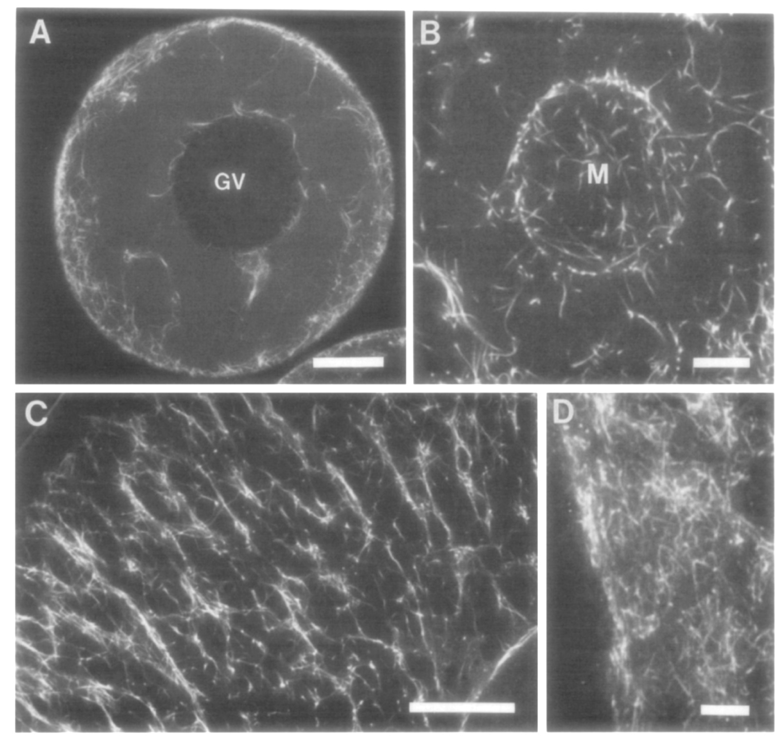 microtubules, organized into radially oriented bundles, are apparent in the animal cortex of this stage VI oocyte (60X obj; bar is 25 Fm). (D)