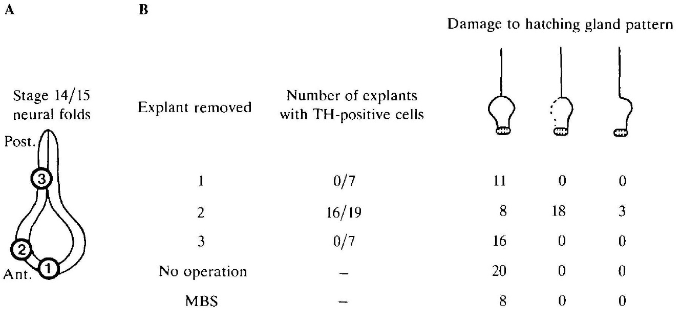 (1) the transverse neural fold; (2) the anterior neural fold; (3) the posterior neural fold. (B) After the operation, explant