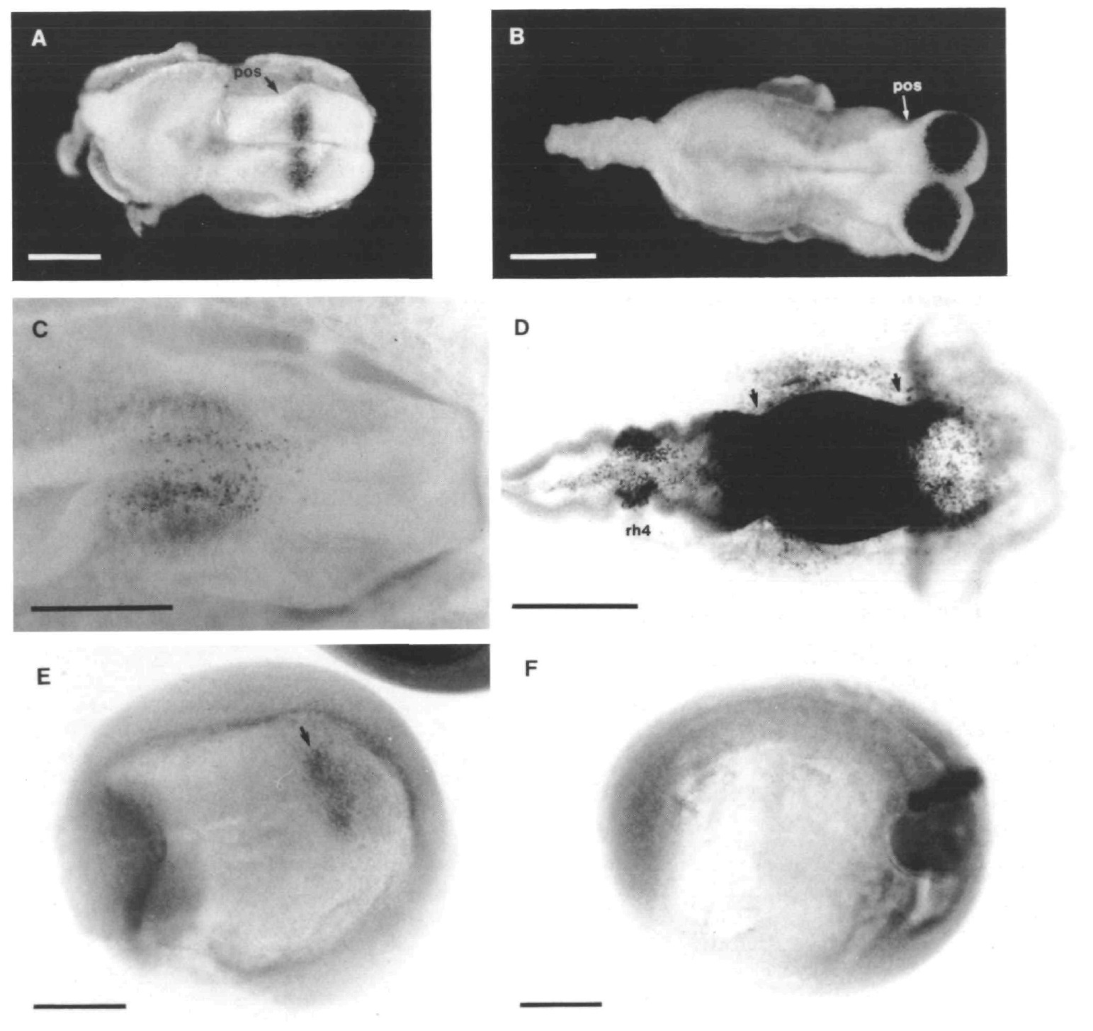 (F) Lateral view of a stage 14 Xenopus embryo. Scale bars represent 0.3 mm.