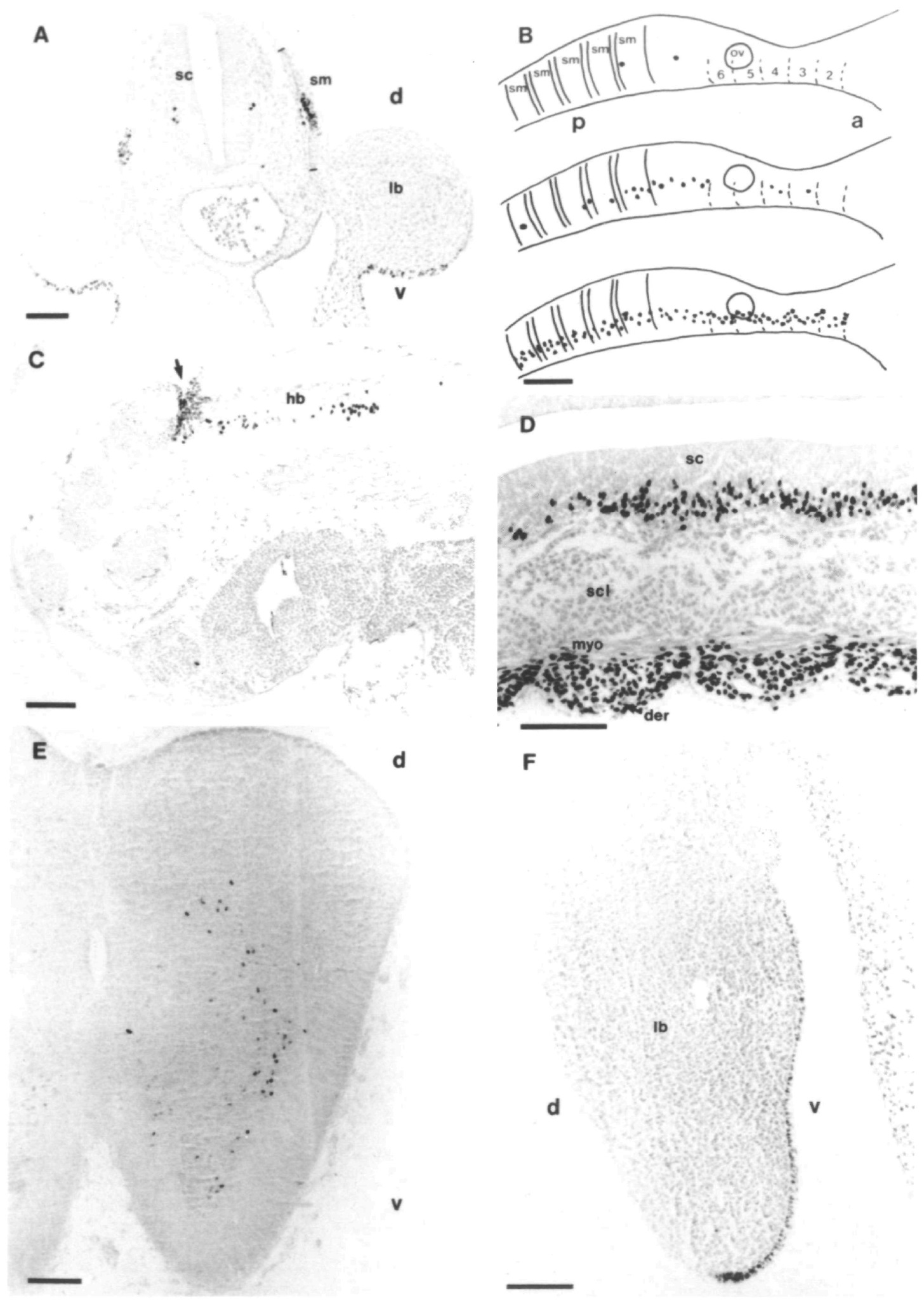 ventral; (lb) limb bud; (sc) spinal cord; (sm) somite.