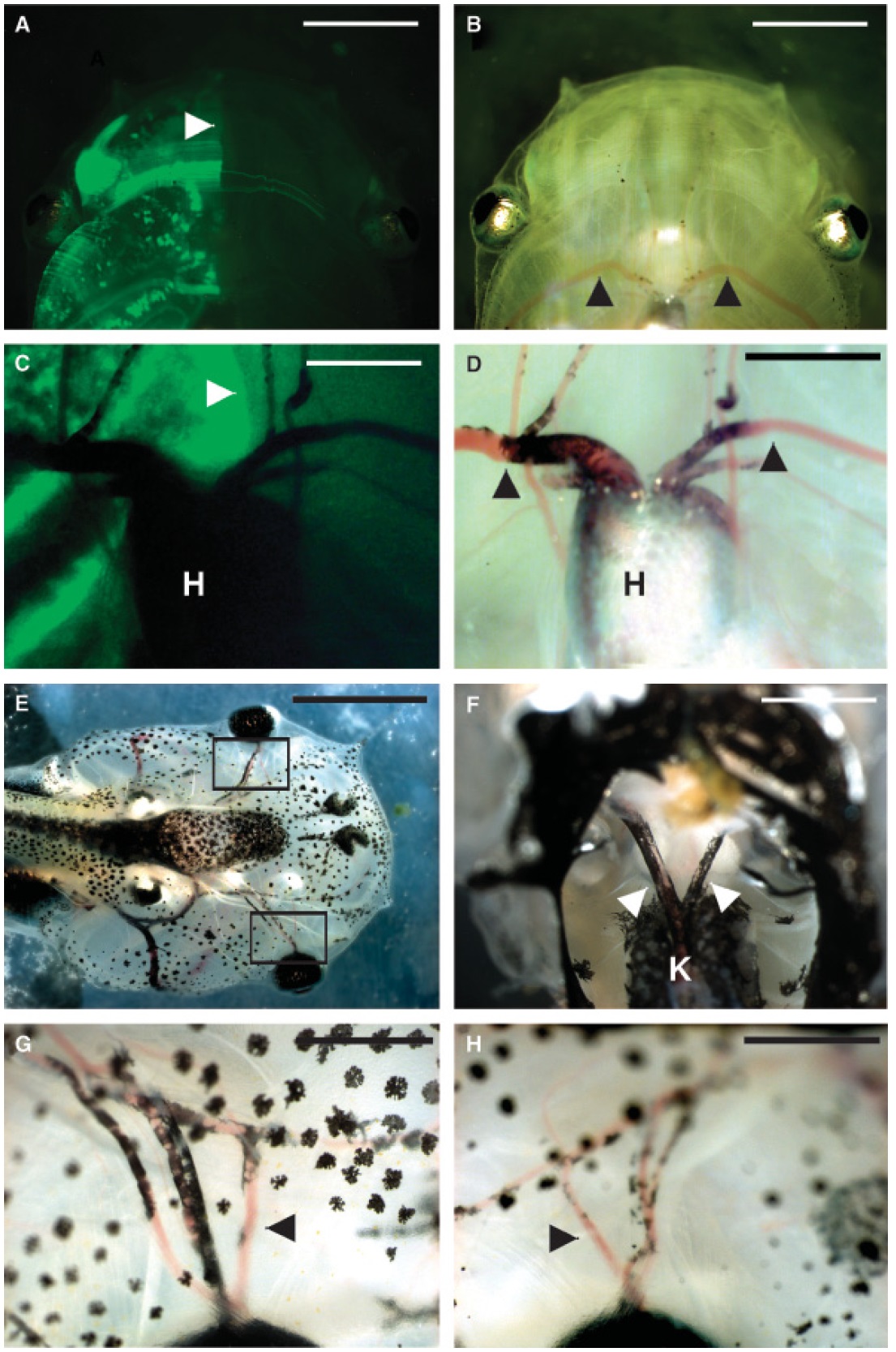 arteries (arrowheads). Dorsal views of the eye vasculatures on the