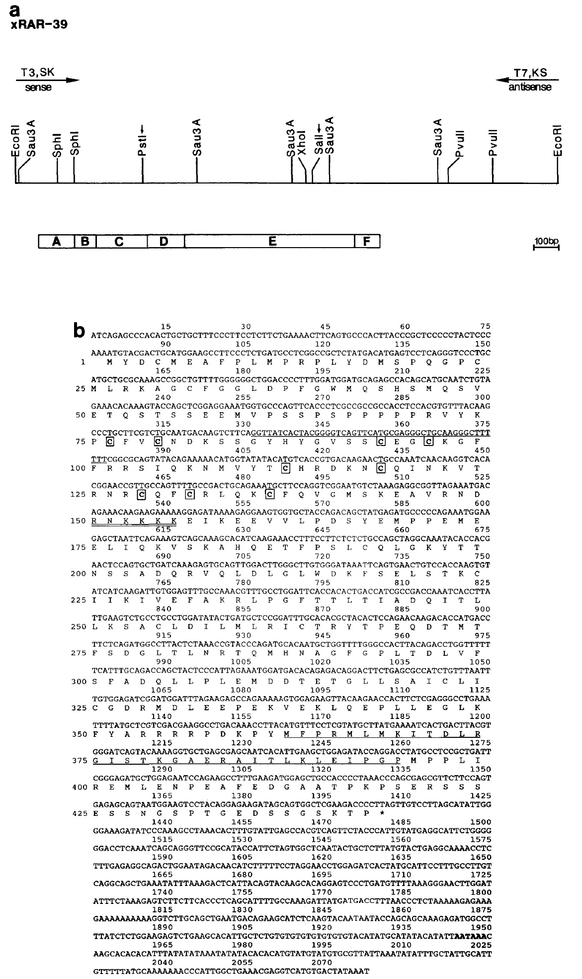 Figure 1. cDNA and predicted amino acid sequences of xRAR-39. [A] Restriction map and schematic representation of the clone