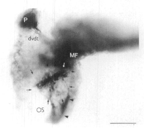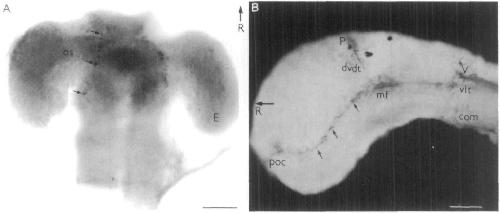 GFAP. The line of cells run from the rostral end of the brain, around the optic stalks (os) and through the