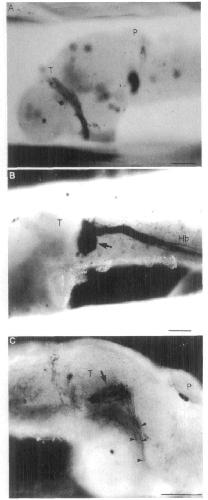 through the hindbrain (Hb). (C) HRP-labelled axons, from