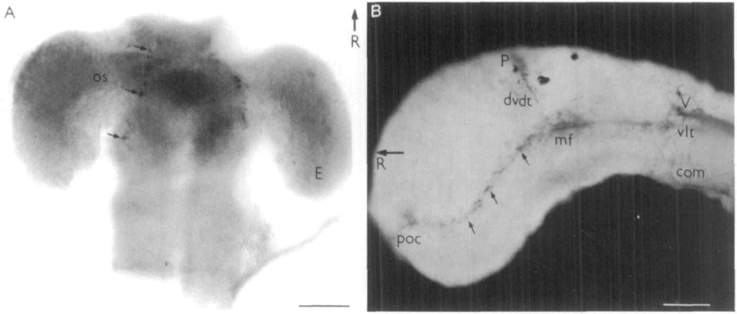 Fig. 1. (A) Ventral view of a stage 34 brain with HRP-labelled axons from the left eye leaving the optic stalk (OS) and