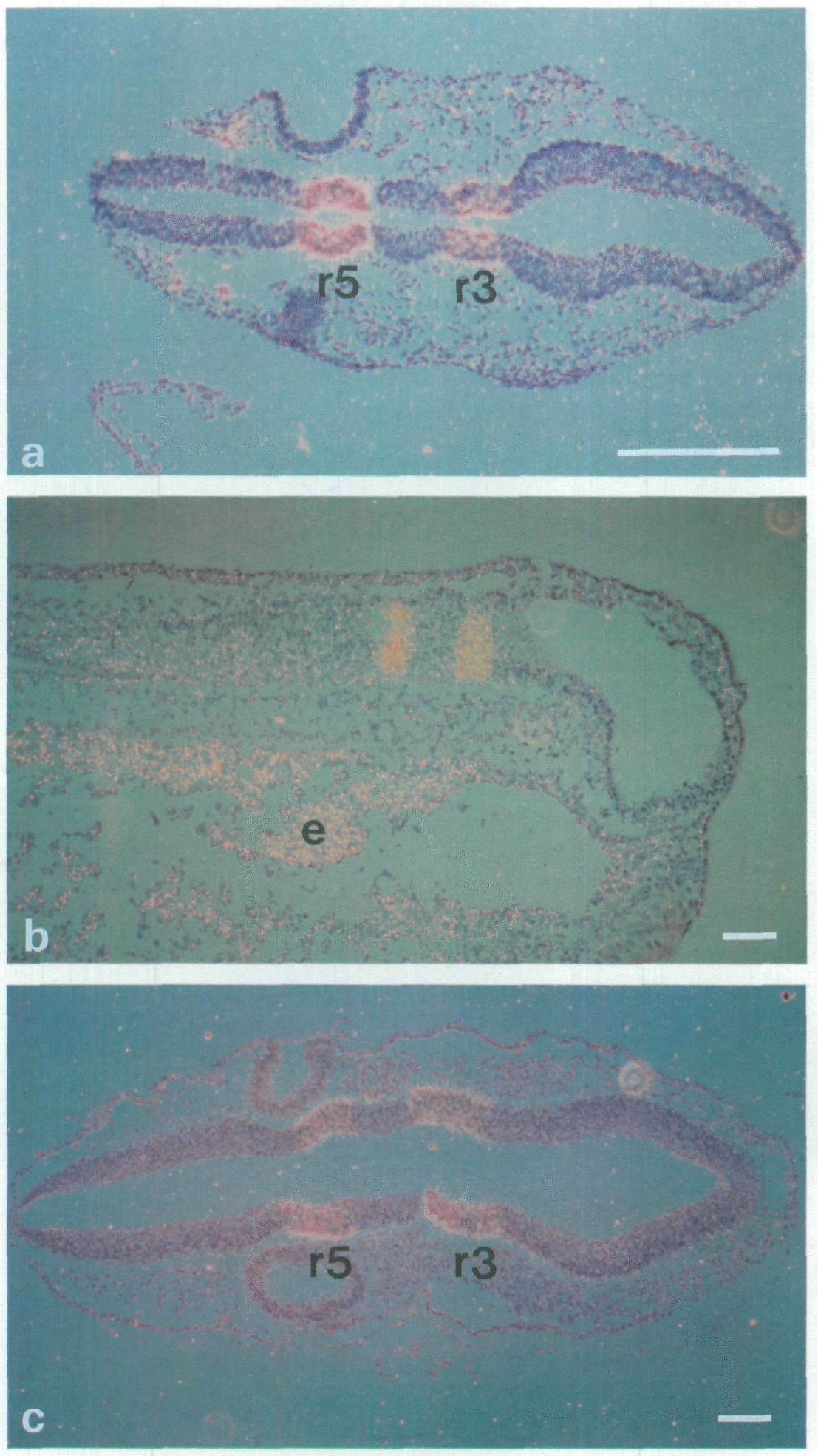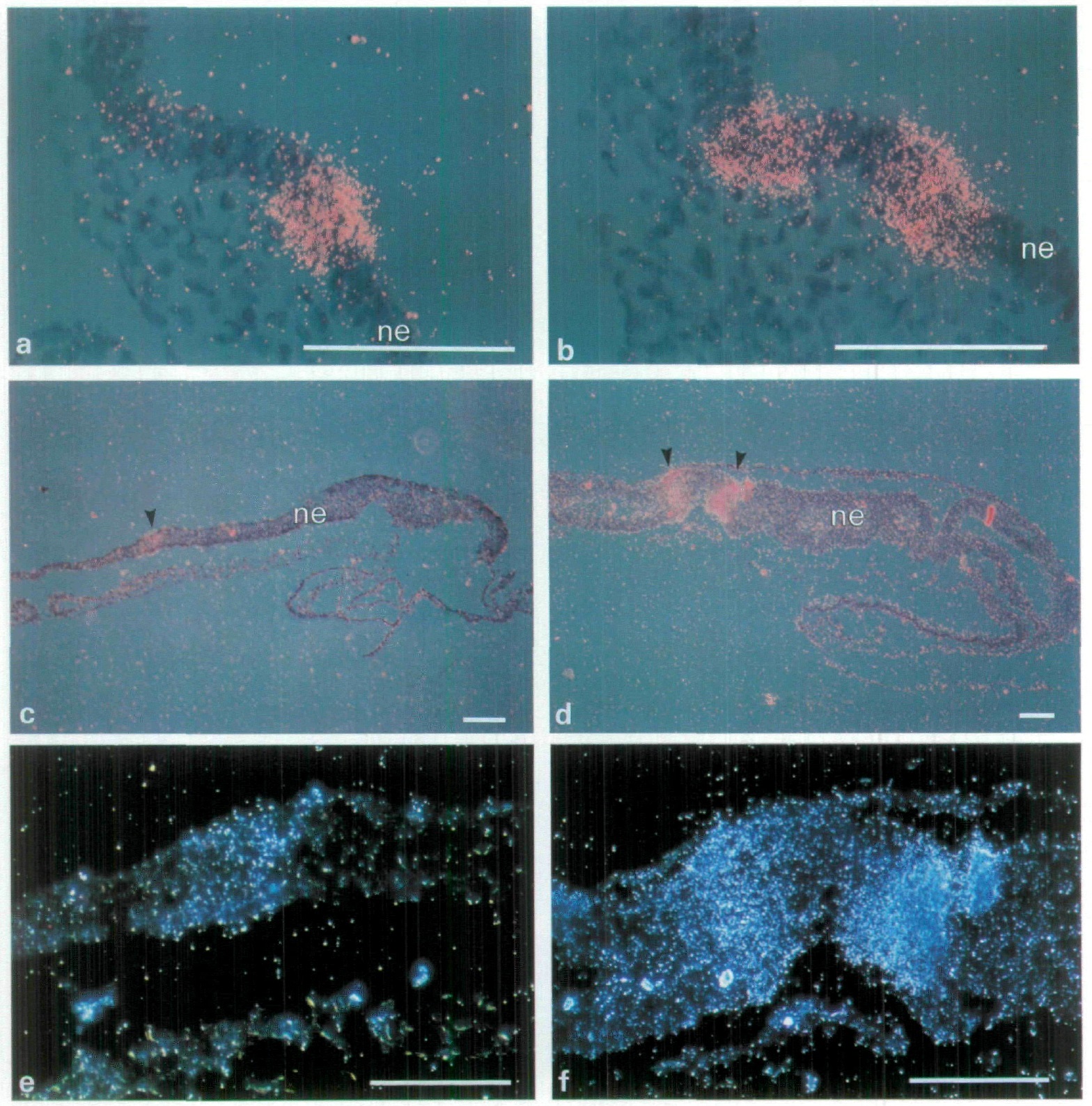 indicate sites of Krox-20 expression, ne, neural epithelium. Anterior is to the right in all photographs, a and b are from