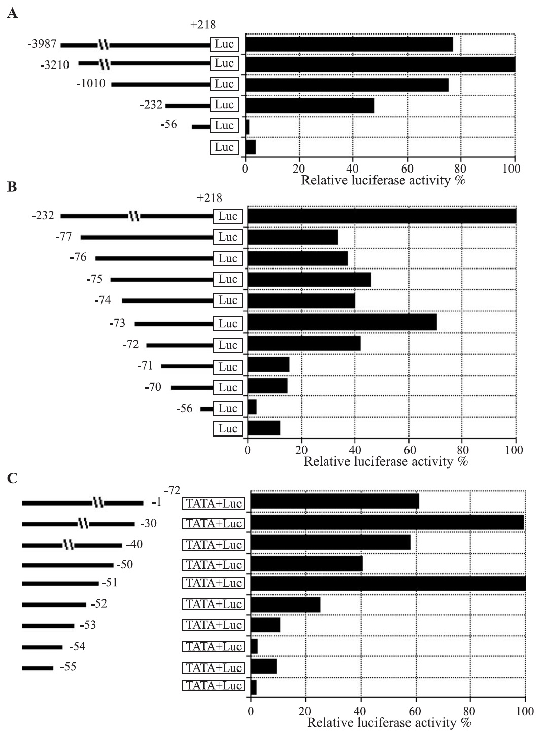 boundary at 72, was assayed. These constructs had a heterologous TATA-box-containing sequence in the immediate upstream of the luciferase-coding