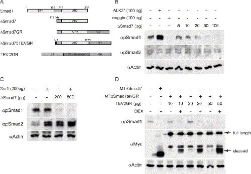 Fig. 1. δSmad73TEVGR is an inducible inhibitor of Smad1 phosphorylation. (A) Diagram of inducible inhibitor constructs. δSmad7 is a deletion of the MH1 domain of Xenopus Smad7, using the methionine at amino acid 172 as a start codon. A glucocorticoid receptor domain is fused to the C terminus of δSmad7 in the δSmad7GR construct. In the MTδSmad73TEVGR construct, three cleavage sites for the tobacco etch virus (TEV) protease are inserted between the C terminus of δSmad7 and the GR domain, and a myc tag is added to the N-terminus. The dexamethasone (DEX) inducible TEV protease (TEV2GR) consists of two GR domains flanking the TEV protease itself. (B) δSmad7 inhibits phosphorylation of Smad1, but not of Smad2. Lysates from uninjected St. 10.5 embryos or from embryos injected at the animal pole at the two-cell stage with mRNA encoding activated ALK2 (ALK2*; 100 pg/embryo), noggin (100 pg/embryo), or increasing amounts of δSmad7 were analyzed by Western blot with anti-phosphoSmad1 and anti-phosphoSmad2 antibodies. Cytoskeletal actin served as a loading control. (C) δSmad7 inhibits Smad1 phosphorylation but causes no reduction in Xnr1 stimulated Smad2 phosphorylation. Embryos were analyzed as in (B), after injection at the 2-cell stage with the indicated doses of RNA encoding Xnr1 or δSmad7 (D) TEV2GR cleaves the GR domain from δSmad73TEVGR in a regulated manner. N-terminal myc tags were added to δSmad7 and δSmad73TEVGR, and mRNA encoding these proteins were injected into two-cell stage embryos (δSmad7: 100 pg/embryo; δSmad73TEVGR: 300 pg/embryo, along with increasing amounts of TEV2GR. 10 μM DEX was added to embryos at the 8-cell stage. After lysis at St. 10.5, accumulation of the cleaved form of δSmad73TEVGR was analyzed by Western blotting with an anti-myc antibody, while concomitant inhibition of Smad1 phosphorylation was assessed using the anti-phosphoSmad1 antibody. |