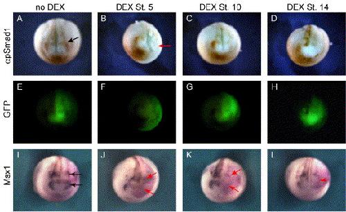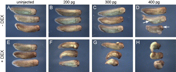 Fig. 2. Phenotypic consequences of δSmad7TEVGR/TEV2GR expression in the absence and presence of DEX. Phenotypes of uninjected embryos (A) or embryos injected with 200 pg (B), 300 pg (C) or 400 pg (D) δSmad7TEVGR mRNA together with 10 pg TEV2GR mRNA. Note the head defects and partial duplication of axes at the highest concentration of δSmad7TEVGR (arrows, D). In the presence of 10 μM DEX, uninjected embryos are phenotypically normal (E), but injected embryos show defects reflecting dorsalization of the embryo (FâH). |