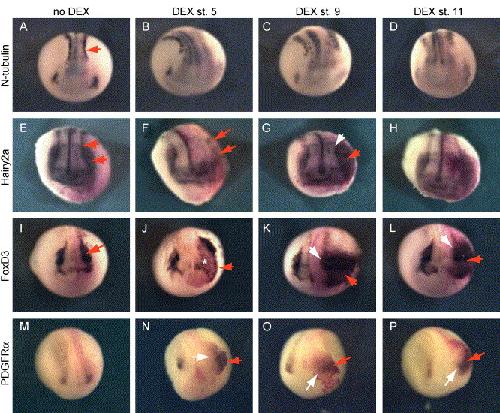 Fig. 7. Effects of δSmad7-mediated stage-dependent BMP inhibition on neural crest and neural plate border. Embryos were injected with 300 pg δSmad7TEVGR RNA and 10 pg TEV2GR RNA and cultured in the absence of DEX (A, E, I, M), or with DEX added at stage 5 (B, F, J, N), stage 9 (C, G, K, O), or stage 11 (D, H, L, P). The effects of stage-specific BMP inhibition on the neural plate border were examined by in situ hybridization for the neural border markers N-tubulin (AâD), and Hairy2a (EâH). Neural crest development was examined by in situ hybridization for Hairy2a (red arrows, EâH), FoxD3 (IâL), and PDGFRα (MâP).(For interpretation of the references to colour in this figure legend, the reader is referred to the web version of this article.) |