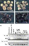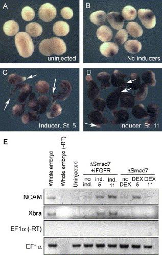 Fig. 10. FGF activation lengthens the period of neural competence in animal caps and induces expression of Xbra. Embryos were injected with 20 pg iFGFR1 and 300 pg δSmad7tevGR/10 pg TEV2GR RNA. Inducers (10 μM DEX and/or 1.25 μM AP20187) were added at stage 5 (C) or stage 11 (D). Animal caps were cut at stage 9 and collected at stage 14, when they were subjected to either to in situ hybridization for Sox2 or to RT-PCR. No Sox2 expression is detected in caps from uninjected embryos (A), and minimal Sox2 is present in caps from injected embryos to which no inducer was added (B). Strong up-regulation of Sox2 is observed in caps to which inducers were added at stage 5 (C). Addition of inducers at stage 11 also strongly activates Sox2 expression (D). This is in contrast to caps from embryos injected with δSmad7tevGR and TEV2GR and activated at stage 11 (compare with Fig. 4F). Note the elongation in caps induced at both stage 5 and stage 11 (arrows, C, D), suggesting mesoderm induction due to the activation of FGF. (F) RT-PCR for NCAM confirms the ability of iFGFR and δSmad7tevGR, but not δSmad7tevGR alone, to induce neural development when activated at stage 11. RT-PCR for Xbra further supports the induction of mesoderm in iFGFR- and δSmad7tevGR/TEV2GR-injected caps, but not in caps injected with δSmad7tevGR and TEV2GR alone. |