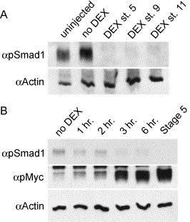 Fig. 3. Inhibition of pSmad1 occurs rapidly after DEX addition. (A) RNA was into both cells of two-cell stage embryos, animal cap explants were isolated at stage 8 and DEX was added when sibling embryos were at either stage 9 or stage 11. The caps were then allowed to develop overnight at 14°C, until sibling embryos had reached stage 16, when they were harvested and phosphoSmad1 levels were analyzed by Western blot. (B) mRNA encoding 300 pg δSmad73TEVGR and 10 pg TEV2GR was injected into both cells at the two-cell stage. Animal caps were isolated and assayed by Western blot with anti-phosphoSmad1 antibody. Cytoskeletal actin was used as a loading control. Culture of embryos and caps was carried out at 14°C. DEX was added either before caps were cut (St. 5) or 6, 3, 2, and 1 h before harvesting at stage 10. One hour after DEX addition, pSmad1 inhibition is substantially inhibited. By 3 h after addition, pSmad1 levels are equivalent to that observed in caps from embryos to which DEX was added at stage 5. |