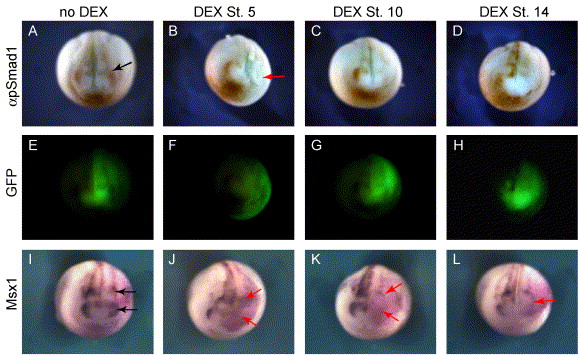 Fig. 5. DEX-dependent inhibition of pSmad1 and of the BMP transcriptional target Msx1. mRNA encoding δSmad7-3TEVGR (300 pg) and TEV2GR (10 pg) were injected into 1 cell of 2-cell stage embryos. To mark the injected side, mRNA encoding either GFP (AâH) or β-galactosidase (IâL) was also included. 10 μM DEX was added at either St. 5, St. 10, or St. 14, with control embryos cultured in the absence of DEX. When DEX is added, inhibition of Smad1 phosphorylation on the injected side is observed by anti-phosphoSmad1 immunostaining (BâD) and by in situ hybridization for Msx1, a transcriptional target of BMP signaling (JâK). Little or no effect is observed on either of these markers in controls where no DEX is added (A, I). |