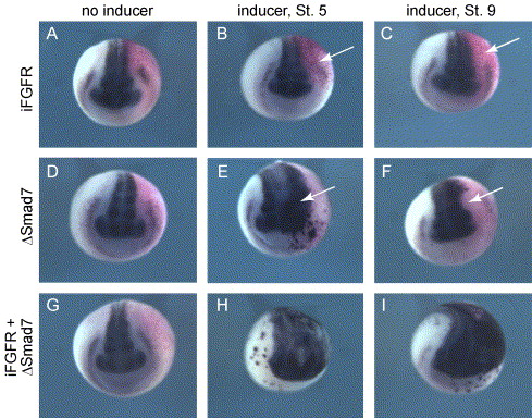 Fig. 8. FGF activation must be combined with BMP inhibition to induce ectopic neural expression during gastrulation. Embryos were injected with 20 pg iFGFR1 RNA (A–C), 300 pg δSmad7TEVGR and 10 pg TEV2GR RNA (D–F), or 20 pg iFGFR1 + 300 pg δSmad7TEVGR/10 pg TEV2GR RNA (G–I). Inducer (10 μM DEX and/or 1.25 μM AP20187) was added at stage 5 (B, E, H) or stage 9 (C, F, I). In the absence of inducer, ectopic neural induction is not observed in injected embryos (A, D, G). No ectopic neural induction is observed on the injected side (arrows) in iFGFR1-injected embryos when AP20187 is added at stage 5 (B) or stage 9 (C). Ectopic neural induction is observed in δSmad7TEVGR/TEV2GR-injected embryos upon addition of DEX at stage 5 (arrow, E), but induction is minimal when DEX is added at stage 9 (arrow, F). FGF activation and BMP inhibition appear to act synergistically, as strong ectopic neural induction is observed when iFGFR and δSmad7TEVGR/TEV2GR are combined, both when inducer is added at stage 5 (H) or at stage 9 (I). |