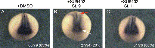 Fig. 9. Inhibition of FGF signaling reduces the size of the neural plate. Embryos were cultured in 0.1à MMR with either 0.005% DMSO (A) or 20 μM SU5402 + 0.005% DMSO added at stage 9 (B) or stage 11 (C). Neural plate formation was examined by in situ hybridization for Sox2. (A) Control embryos treated with DMSO exhibit normal neural plates (66/79 normal). (B) Addition of SU5402 at stage 9 causes spina bifida (red arrow) and reduction of the anterior neural plate (white arrow). Only 27/94 embryos examined exhibited normal-sized anterior neural plates. (C) 61/76 embryos to which SU5402 was added at stage 11 exhibit normal-sized neural plates. Spina bifida is absent in most embryos.(For interpretation of the references to colour in this figure legend, the reader is referred to the web version of this article.) |
