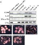 Fig. 4. Stage-dependent neural induction in isolated embryonic ectoderm. Neural induction in embryos injected with 300 pg δSmad7TEVGR and 10 pg TEV2GR was examined by RT-PCR for N-CAM or Sox-2 (A) or in situ hybridization for Sox2 (BâF). (A) Addition of DEX induces strong neural expression in caps from embryos to which DEX was added at stage 4. Neural markers are also up-regulated upon addition of DEX at stage 9, though the neural response is decreased. Neural marker expression is absent in caps to which DEX is added at stage 11. (B) Little or no Sox2 expression is observed in β-gal-injected caps or in δSmad7TEVGR/TEV2GR-injected caps to which no DEX was added (C). Caps from δSmad7TEVGR/TEV2GR-injected embryos to which DEX was added at stage 4 show strong Sox2 upregulation (D). Up-regulation of Sox2 is diminished in δSmad7TEVGR/TEV2GR-injected caps to which Dex was added at stage 9 (E), and absent upon addition of DEX at stage 11 (F). (A) This effect was also observed by RT-PCR. Little induction of the neural markers Sox2 or NCAM is observed in the absence of DEX. |