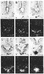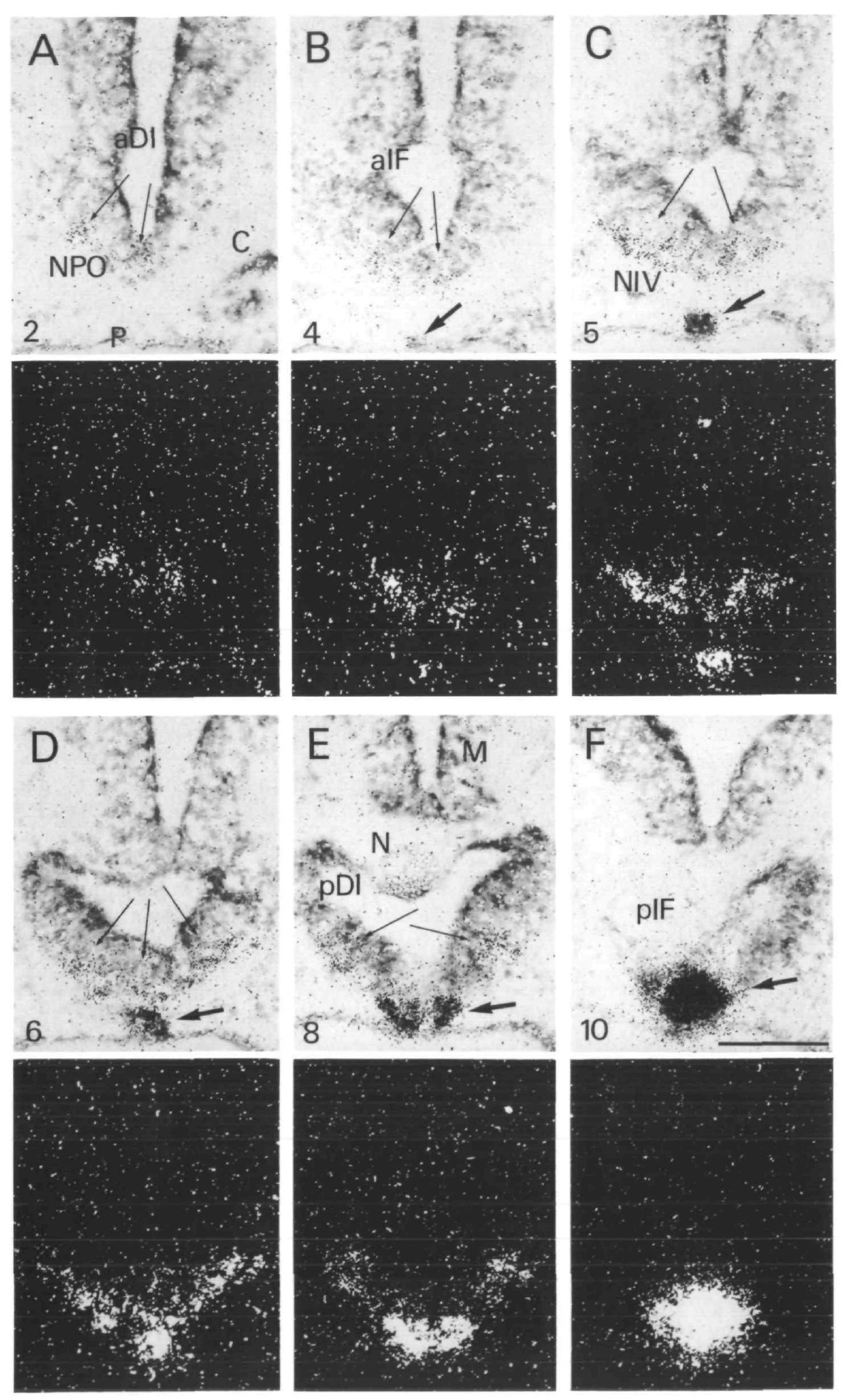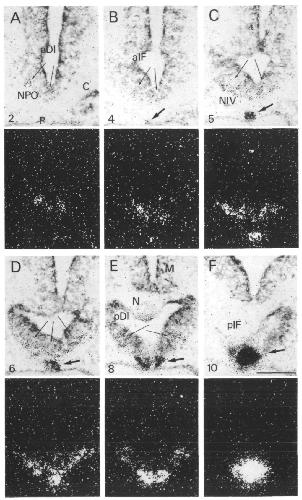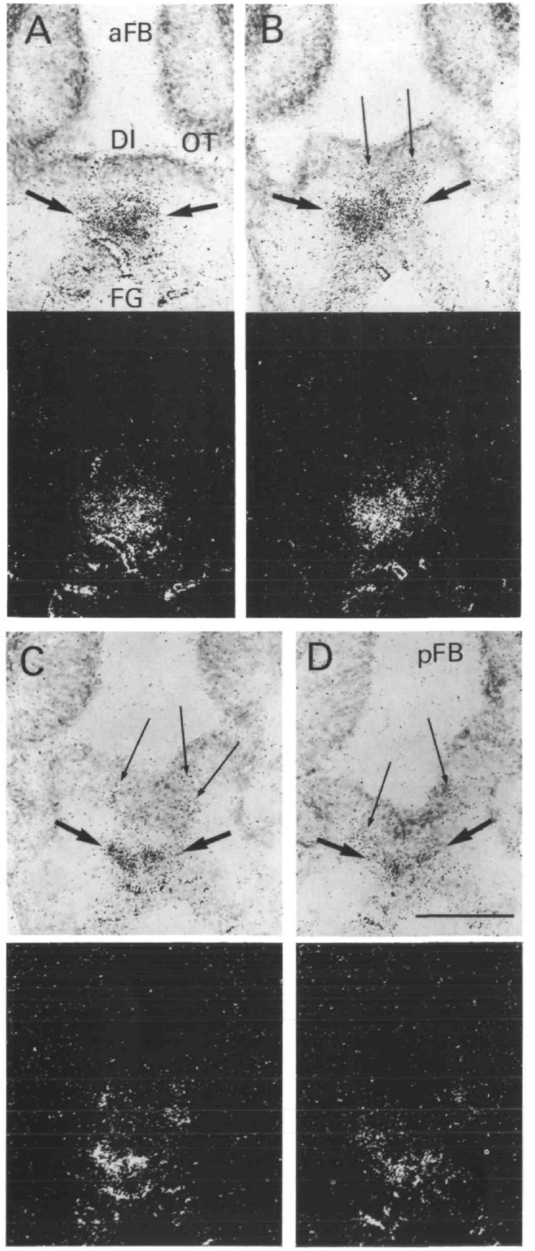 To identify cellular interactions that underlie the spatially appropriate transcription of neural genes, we characterized the embryonic development of proopiomelanocortin (POMC) gene expression in Xenopus laevis using in situ hybridization histochemistry. This has led to the establishment of a unique model system for studying how a neuropeptide gene program in four distinct cell groups is set up in pituitary and forebrain. The embryonic onset and patterning of POMC expression was found to be spatially and temporally correlated inside and outside the brain. The first POMC cells in the pituitaryprimordium and diencephalon were juxtaposed near the infundibulum at stage 29/30, indicating they undergo molecular differentiation much earlier than previously reported for this system. By stage 31/32, many more POMC cells appeared in the morphologically undifferentiated pituitaryprimordium and brain. In fact, these cells were seen throughout the presumptive anterior and intermediate lobes of the pituitary and posteriordiencephalon at the same time that the pituitaryprimordium is translocating ventral to diencephalon. By stage 39/40, coordinated morphogenesis produced the adult pattern of POMC cells localized in distinct anterior and intermediate pituitary lobes and two diencephalic nuclei. We propose in light of these findings that embryonic cells in the pituitaryprimordium and brain are simultaneously induced to transcribe the POMC gene, possibly as a result of reciprocal brain-pituitary interactions.
