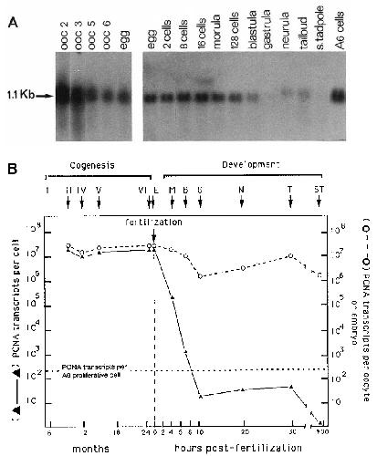 above and analyzed in the same experiment. The slight decrease in PCNA in the morula and tailbud stages was not observed in other