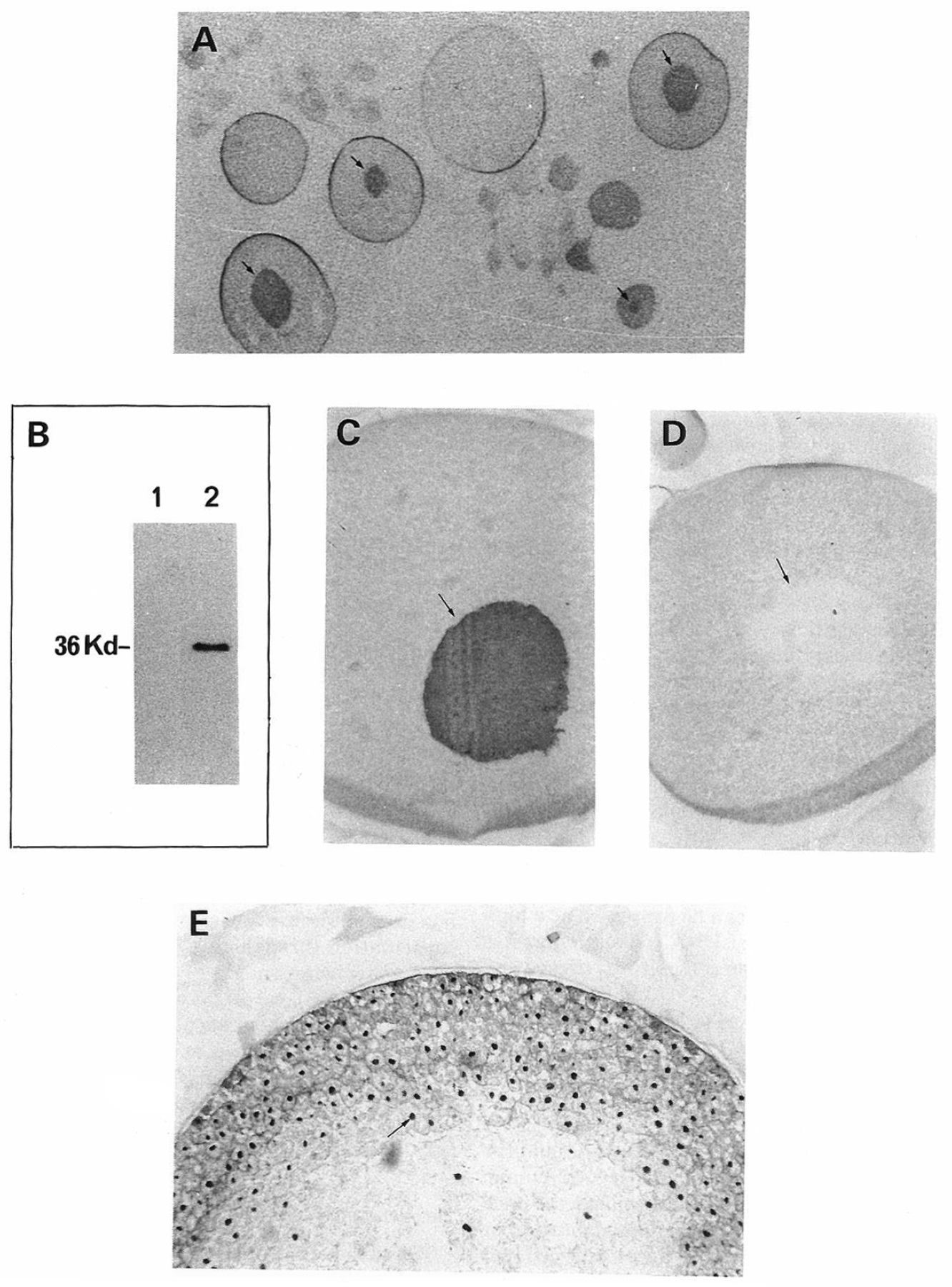 Immunoblotting analysis with the wGSIL antibody of cytoplasmic (lane 1) and germinal vesicle (lane 2) fractions of an oocyte stage VI. (C) and