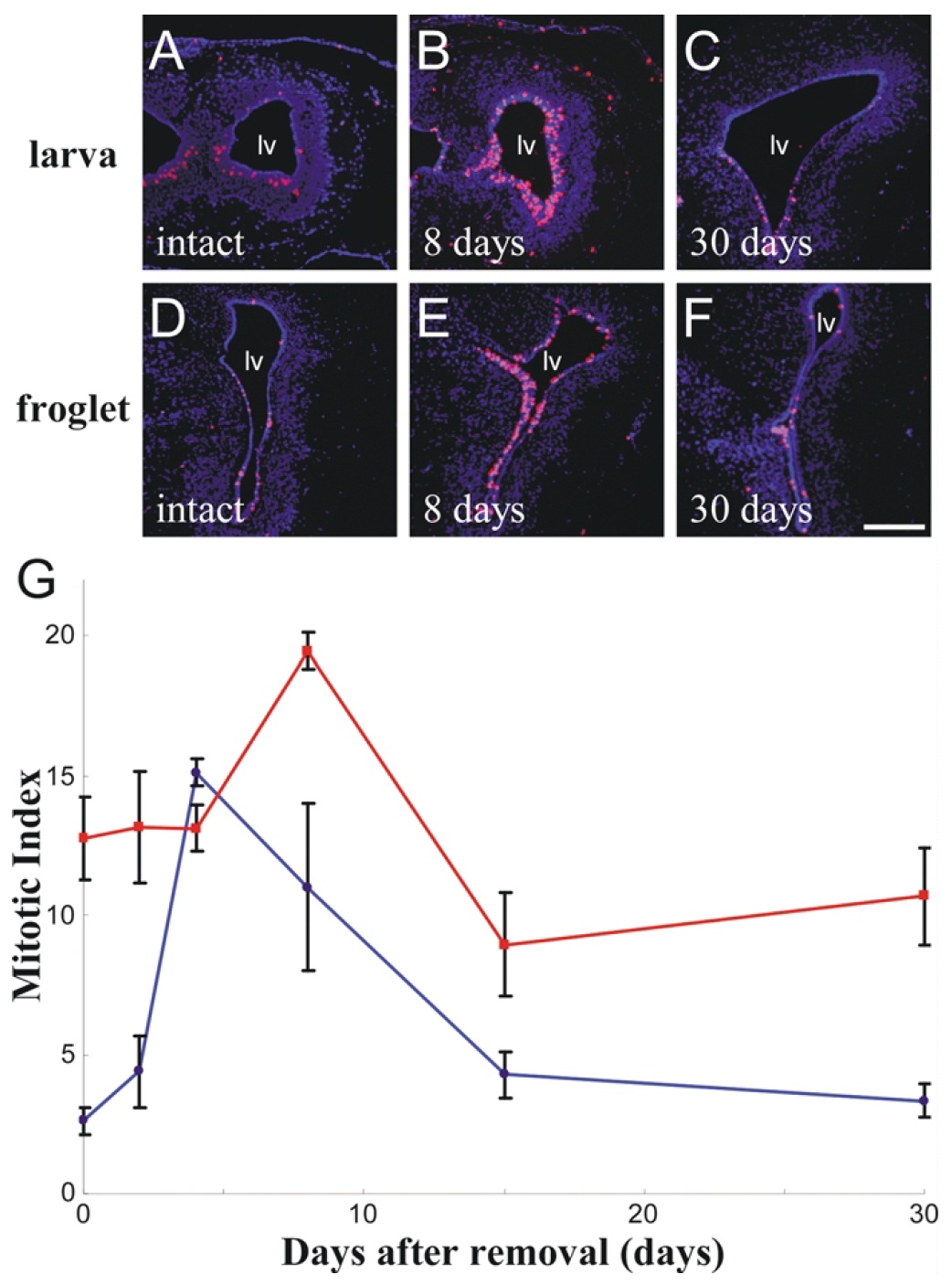 after the tissue dissection, the ventricles were open at the anterior end (B–E). As late as 30 days after the removal of tissue, the