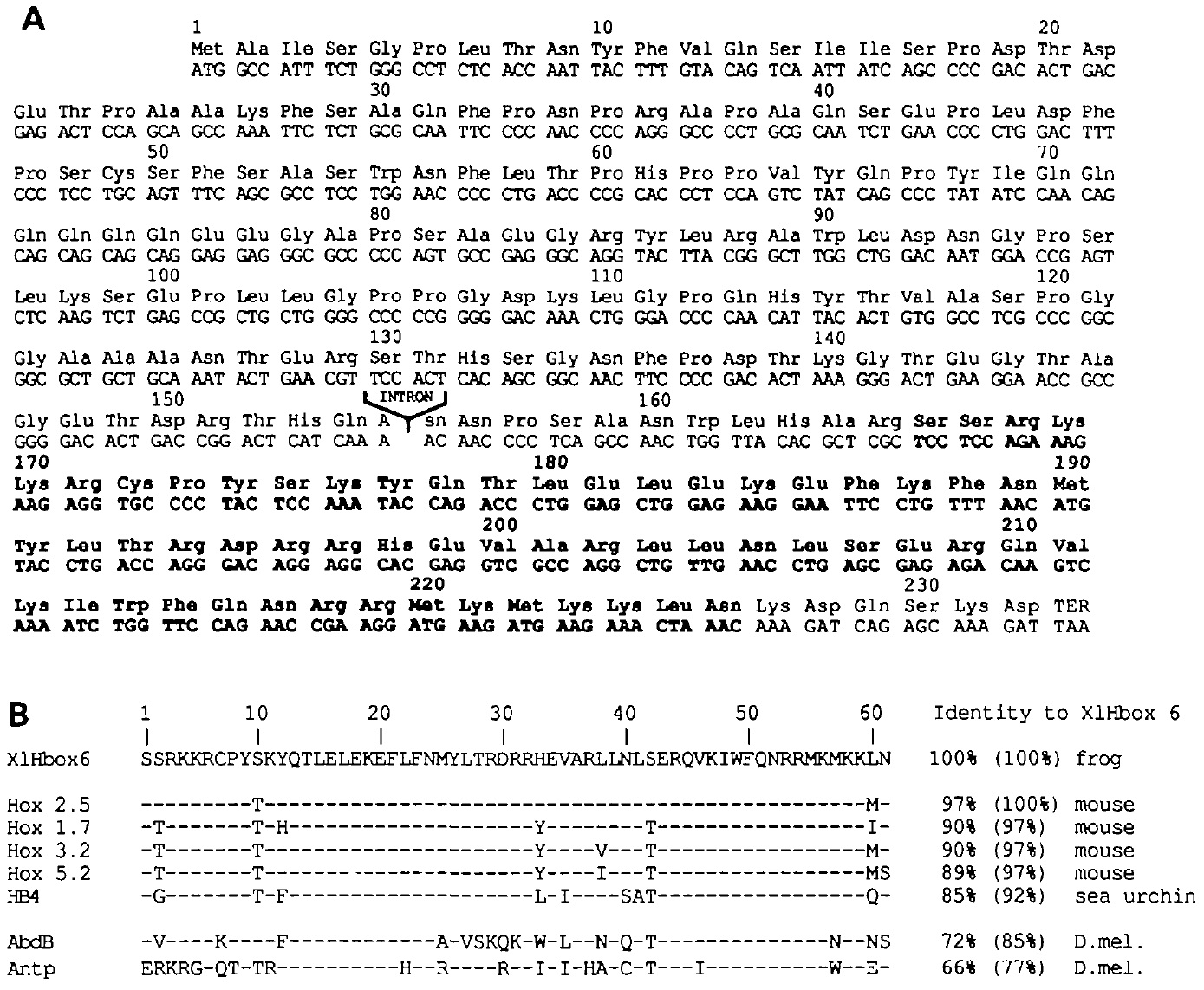 Fig. 2. Sequence of the XlHbox 6 homeodomain protein. (A) The nucleotide and deduced amino acid sequence of the