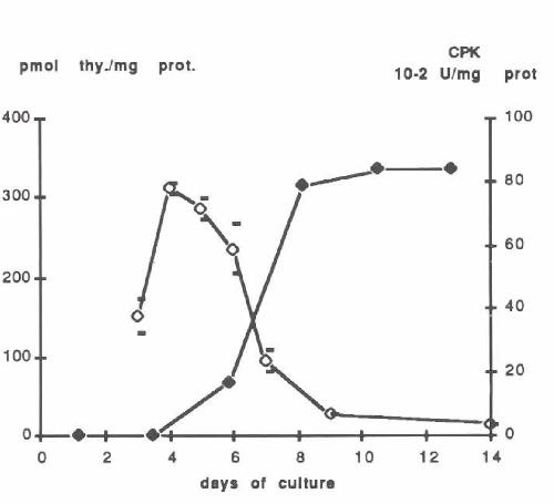 kinase in rat satellite cell cultures. DNA synthesIs was measured after 6h incubation wlth.1H-Thymldlne. M-Crearme phosphokinase was measured by the level of creatine phosphate present in culture.