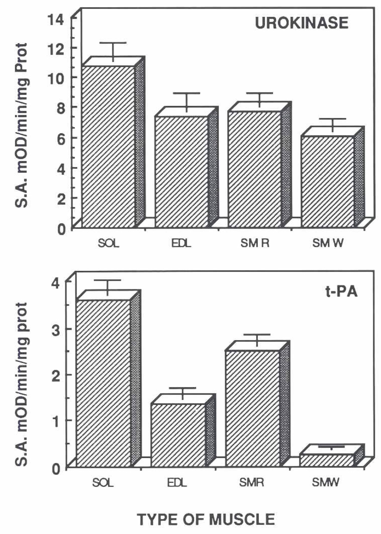 Extracts were obtained as described in Barlovatzet al. (19901. To measure urokinase content, the assay was performed in rhe presence of 400 nM plasminogen and 1.6 mM of rhe synthetic substrate 5-2251. Plasmin generation was detected by measuring p-nirroaniline release from the substrate. To measure t-PA content, fibrin-bound t-PA was determined in the presence of O.2,uM of plasminogen and O.6mM of the synthetic substrate CBS 3308. Values are expressed in specific activities (mOD/mini mg prot)o Both slow Soleus and fast EDLmuscles contained more UK than t-PA bur rhe amount was larger in Soleus, indicating greater myogenicity.