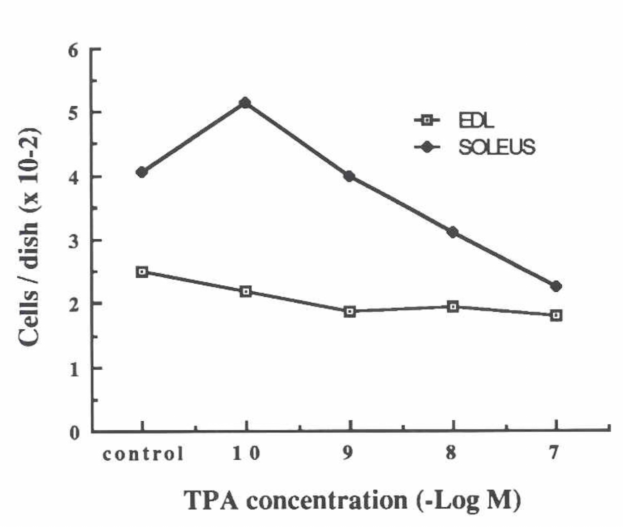 Fig.16. Effect of TPA treatment on the proliferation of satellite cells isolated from Soleus or EDL. after 5-day culture. A low concentration