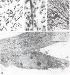 Figs. 1-.4. Histology of in vitro myogenesis. (1) 4-day rat myogenic cell culture before the beginning of cell fusion. Glemsa srainmg (x450i. M: Mltosis. (2) 6-day culture; early myotube with a cell in satellite-like position (arrow). Giemsa staining (x45OJ. (3) Low magnification view of a 14-day culture showing a network of myotubes. Giemsa staining (x 150). (4) Electron micrograph of fusion between the early myotube and rhe satellite cell mdlcated by an arrow in the Inset. Distinct remnants of rhe myorube and the satellite cell membranes are still visible in the contact and consecutive fusion area (x4400; Inset x100)